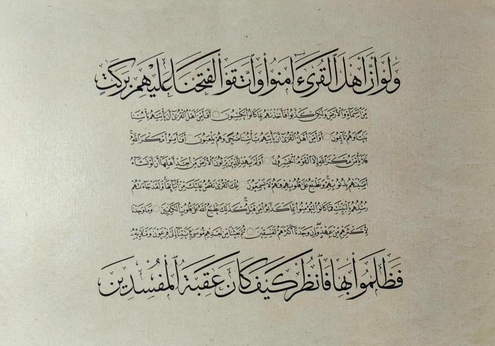 · جاءت اللوحة بأسلوب رفيع المستوى، اتسم بالدقة والانسجام بين الحروف والتراكيب، مع الموازنة بين المساحات البيضاء والتشكيل، مما عكس قدرة الفنان على ضبط الجماليات البصرية للآيات.