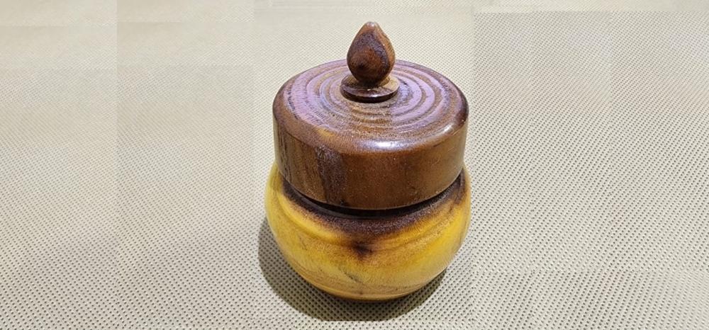 محبرة فنية على شكل قبة، مصنوعة من الخشب، ذات طلاء متموج، ومن الداخل زجاجية.